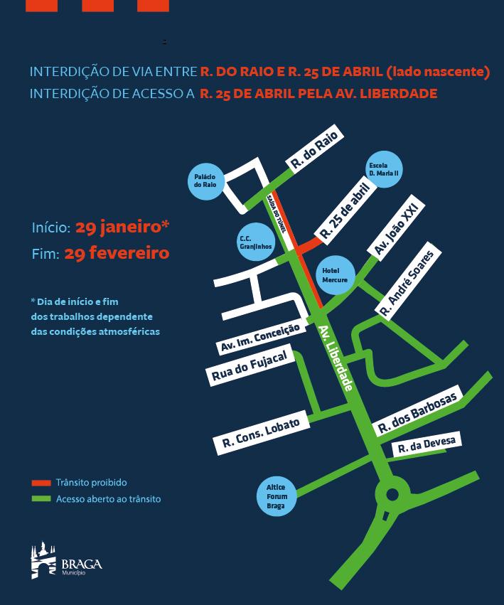 A Câmara Municipal de Braga avançou esta sexta-feura que as obras de requalificação da Avenida da Liberdade vão entrar na última fase a partir do dia 29 de janeiro (data dependente das condições climatéricas). Vão ser assim tomadas novas medidas na circulação de trânsito.