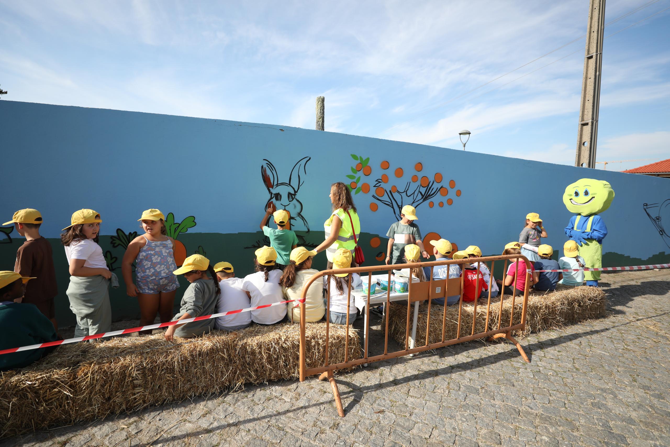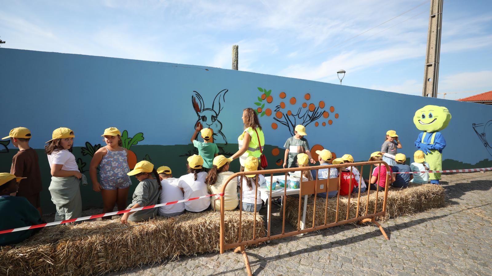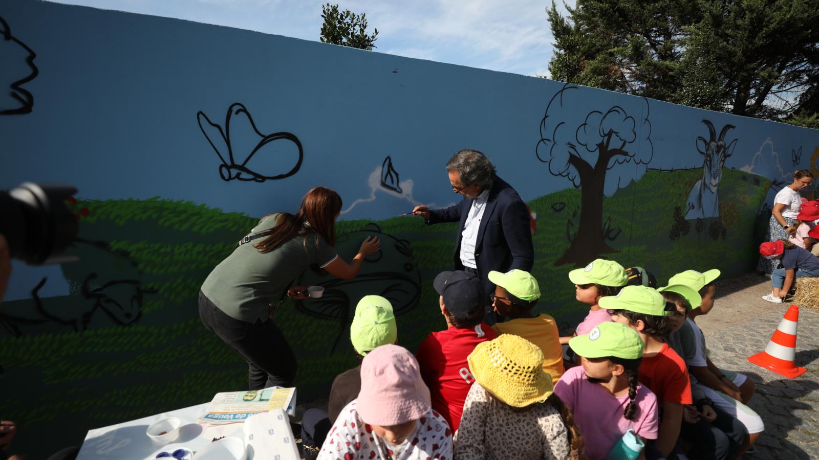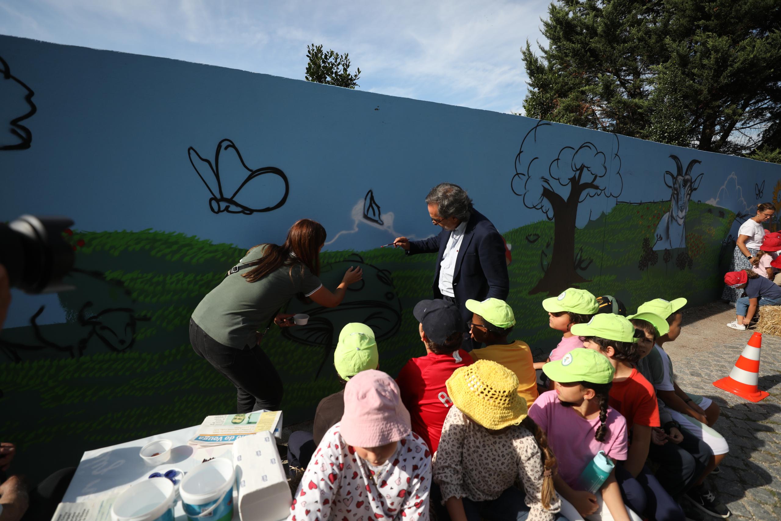 O muro da Quinta Pedagógica de Braga ganhou uma nova cor, servindo agora de espelho de toda a ruralidade que ali se respira. A obra é de Nuno Mendes (Silkarte), que há uma semana se vem dedicando ao projeto, e foi ontem complementada pelas mãos de convidados especiais, nomeadamente crianças do Centro Escolar de S. Frutuoso, Fundação Vieira Gomes e EB1 de Real, utentes da CERCI e idosos da Casa do Areal.