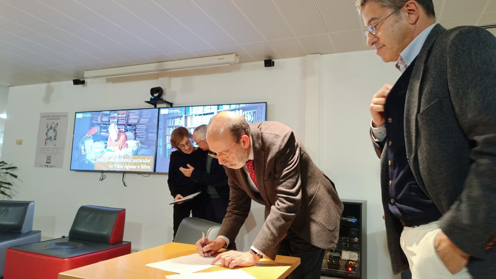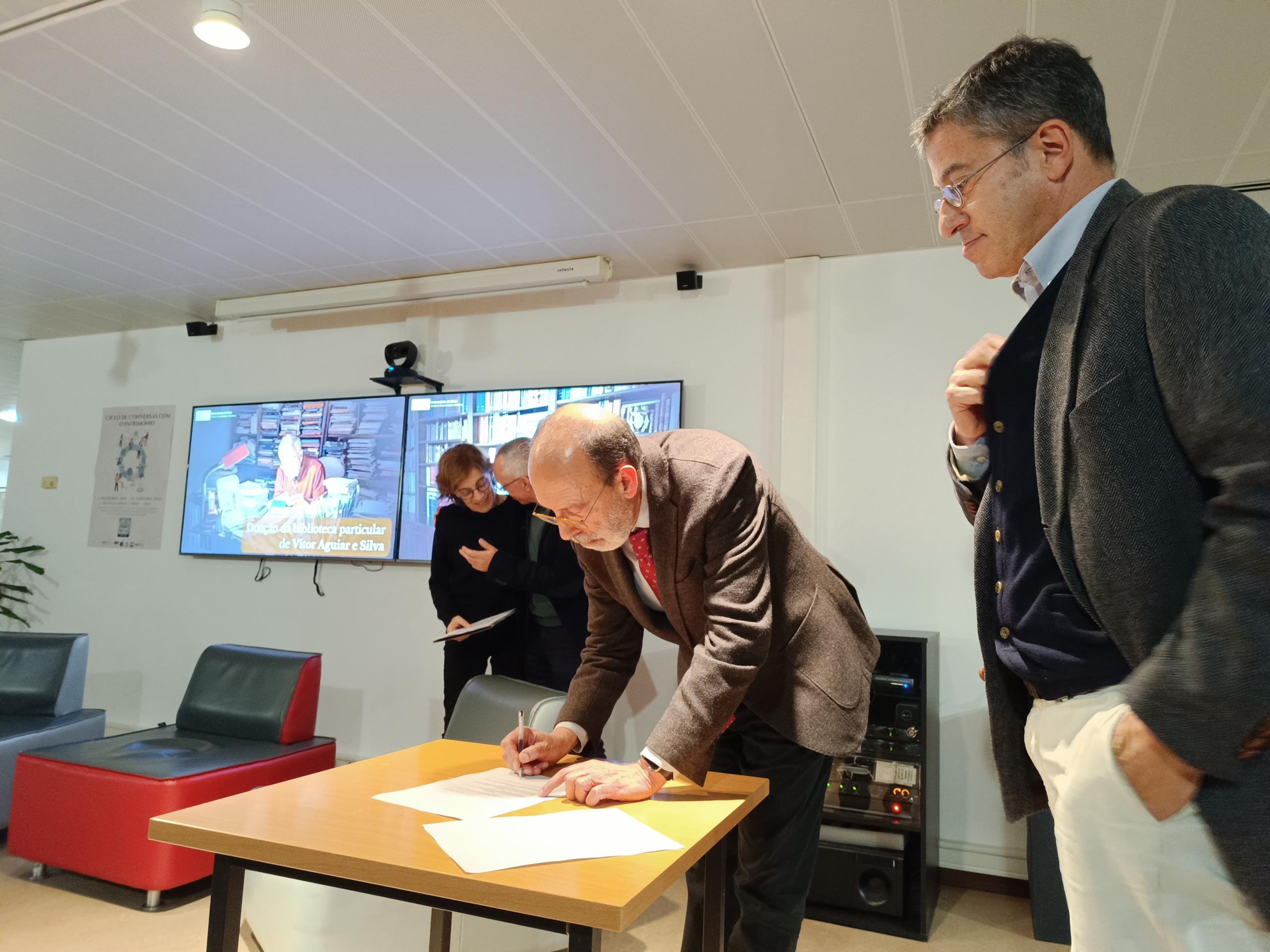 Na presença de vários vice-reitores, familiares, professores, funcionários da Biblioteca da UMinho, diretoras das bibliotecas Lúcio Craveiro da Silva e Biblioteca Pública de Braga, o reitor Rui Vieira de Castro e Miguel Aguiar e Silva, assinaram simbolicamente o auto de doação da Biblioteca Particular do antigo professor de Literatura da UMinho.