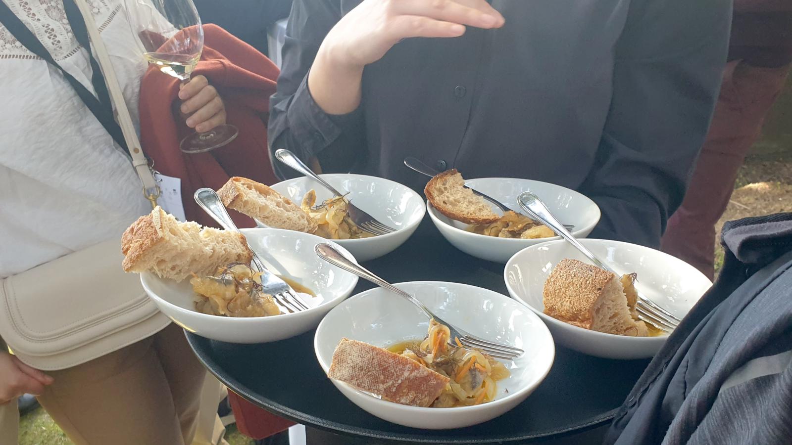 Seguiu-se um sopa de peixe, com corvina, robalo selvagem, ovas de robalo, santolas e camarão da costa, para «harmonizar com Vinhos Verdes com mais estrutura, mas na mesma com a boa frescura desses vinhos», disse.