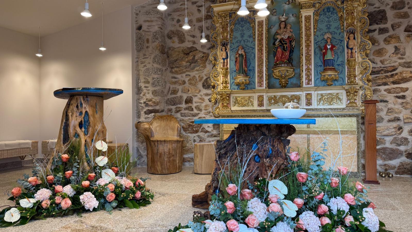 O novo altar e ambão foram concebidos pelo Atelier Amadeus, a partir de raízes de oliveira.