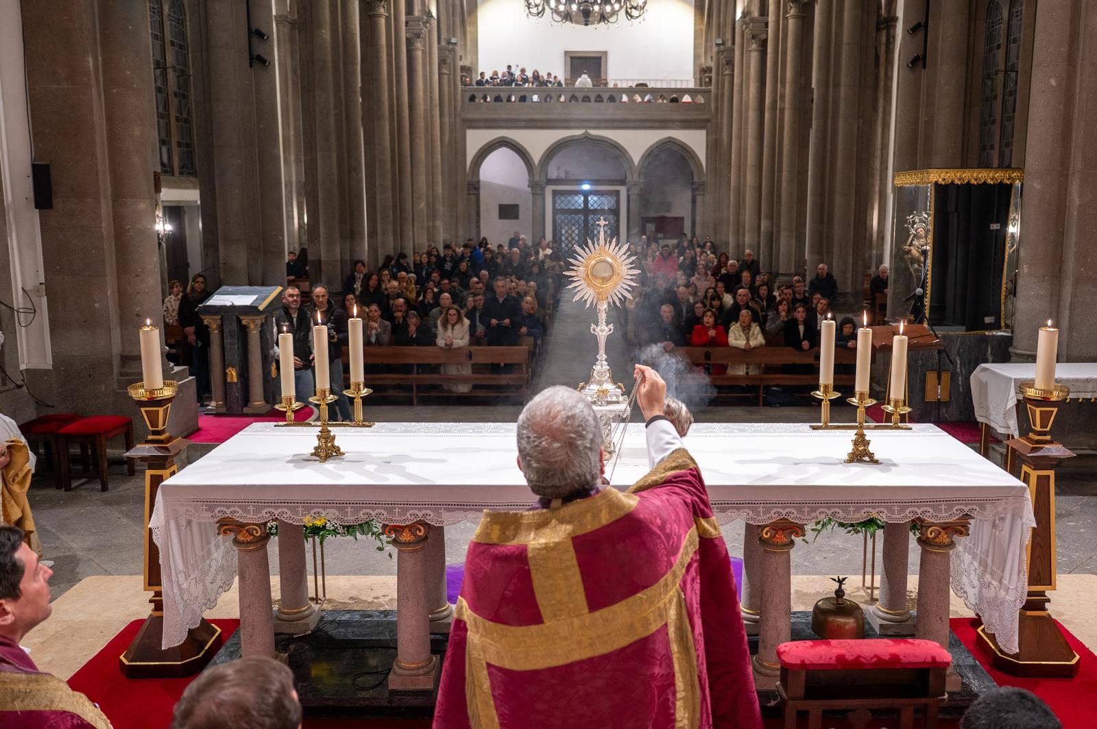 A vigília de oração incluiu um momento de adoração eucarística no contexto do Lausperene da Arquidiocese de Braga, contando também com a presença de sacerdotes e diáconos que estão ao serviço das comunidades de Fafe.