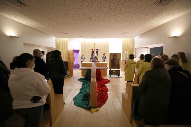 Cruz Peregrina e o ícone de Nossa Senhora Salus Populi Romani foram acolhidos hoje no Hospital de Braga, atraindo a atenção de dezenas de pessoas que circulavam pelo corredor central.