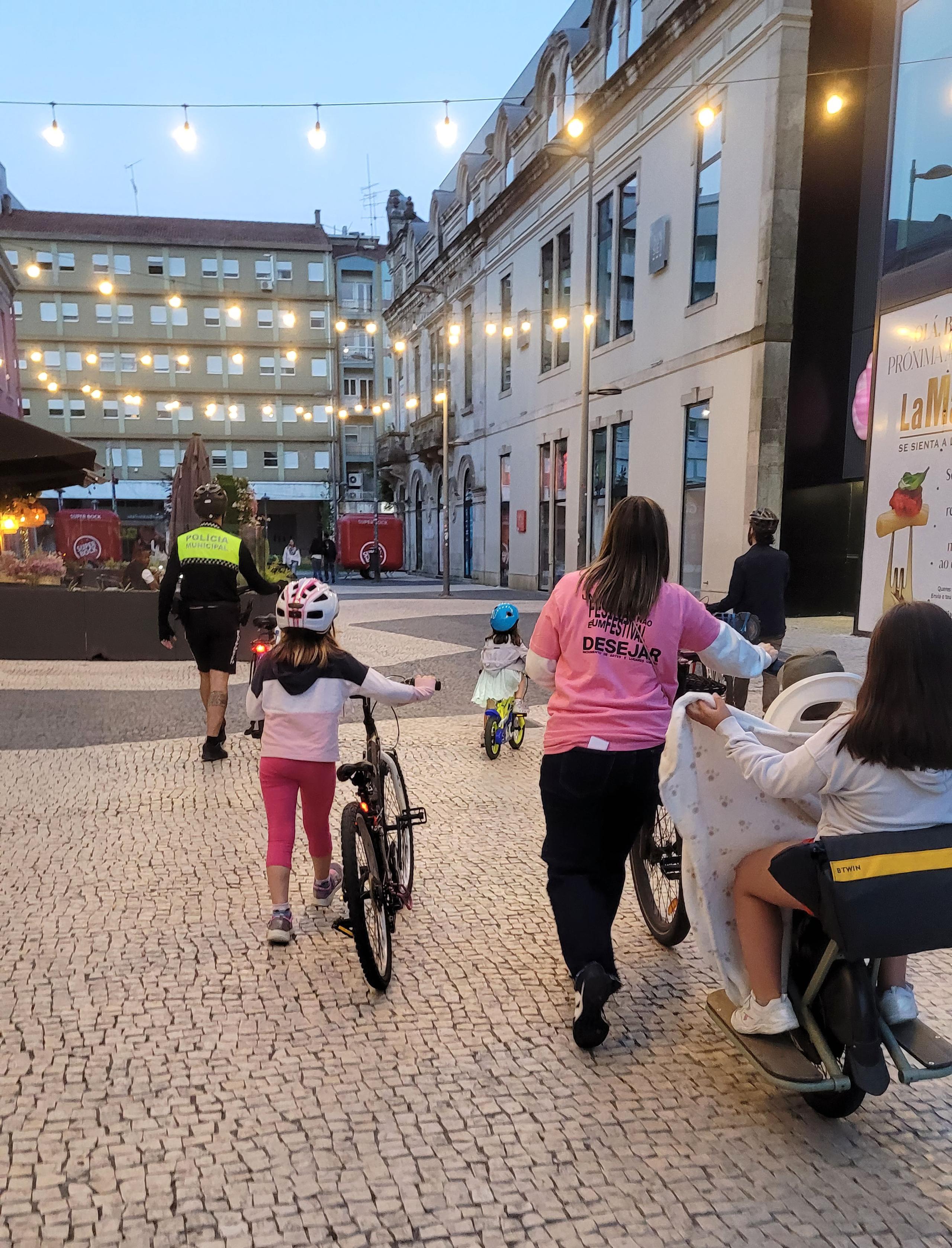 No coração da cidade — o chafariz, a Arcada e a Avenida Central — pulsa a alma bracarense. Aí acontecem encontros casuais, grandes eventos, celebrações e protestos. Como batimentos cardíacos, esses momentos marcam o ritmo da vida da cidade. Mas mesmo neste centro vital, quando tentamos percorrê-lo de bicicleta, com suavidade e respeito, somos travados. Espaços amplos que poderiam acolher a bicicleta de forma natural tornam-se interditos. Fomos obrigados a desmontar e caminhar, enquanto os carros continuam a circular. A pergunta impõe-se: que prioridade damos aos diferentes modos de viver a cidade?